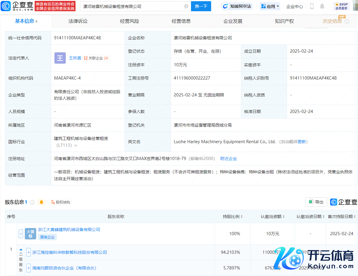 企查查APP清醒,近日,漯河哈雷机械设备租出有限公司斥地,法定代表东谈主为王林喜,注册本钱为10万元,权术限度包含:机械设备租出;建筑工程机械与设备租出;租出干事;特种设备销售;特种设备出租等。企查查股权穿透清醒,该公司由海南华铁(603300)旗下浙江大黄蜂建筑机械设备有限公司全资执股。
