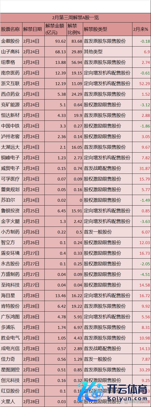 数据显露,2月24~2月28日历间,共有35条股票解禁纪录开云体育,2月24日这天,有高达16条。其中,金徽股份 2 月 24 日的解禁金额颇为惊东谈主,高达 93 亿元,一齐为首发原推动限售股份!另有多家个股解禁金额超10亿元,比如山子高科解禁金额68亿元,海目星解禁金额13亿元。